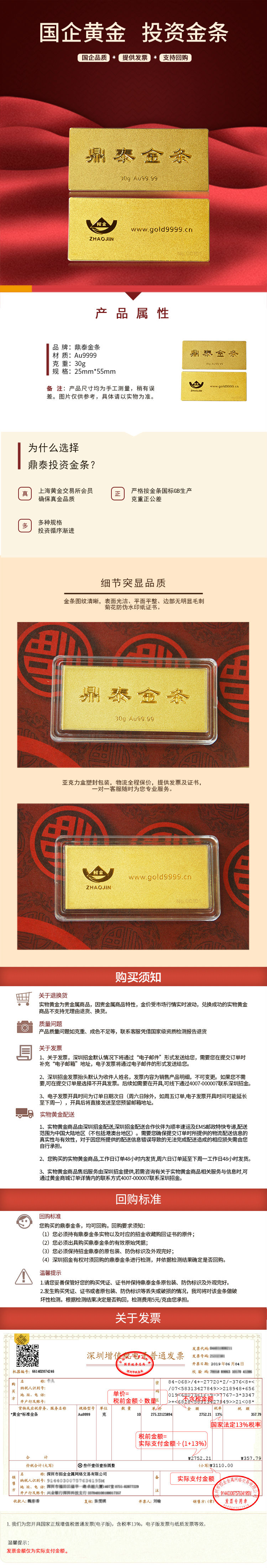 招金 Au9999鼎泰投資金條30克 投資保值收藏